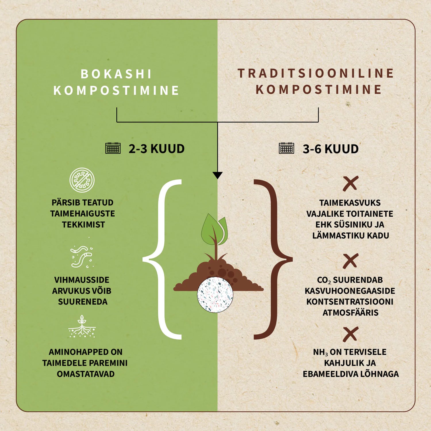 Bokashi kasutab kompostimiseks häid baktereid ehk efektiivseid mikroorganisme ning teeb seda biojäätmetele lisatavate spetsiaalsete kliide abil. Bokashi kliid on segu tõhusatest mikroorganismidest, mis kompostris olles hoiavad ära jäätmete mädanemise, seetõttu ka ebameeldivad lõhnad. Mädanemise asemel toimub kompostris käärimisprotsess ja mõne nädalaga valmib biojäätmetest toitainerikas kompostialus.
