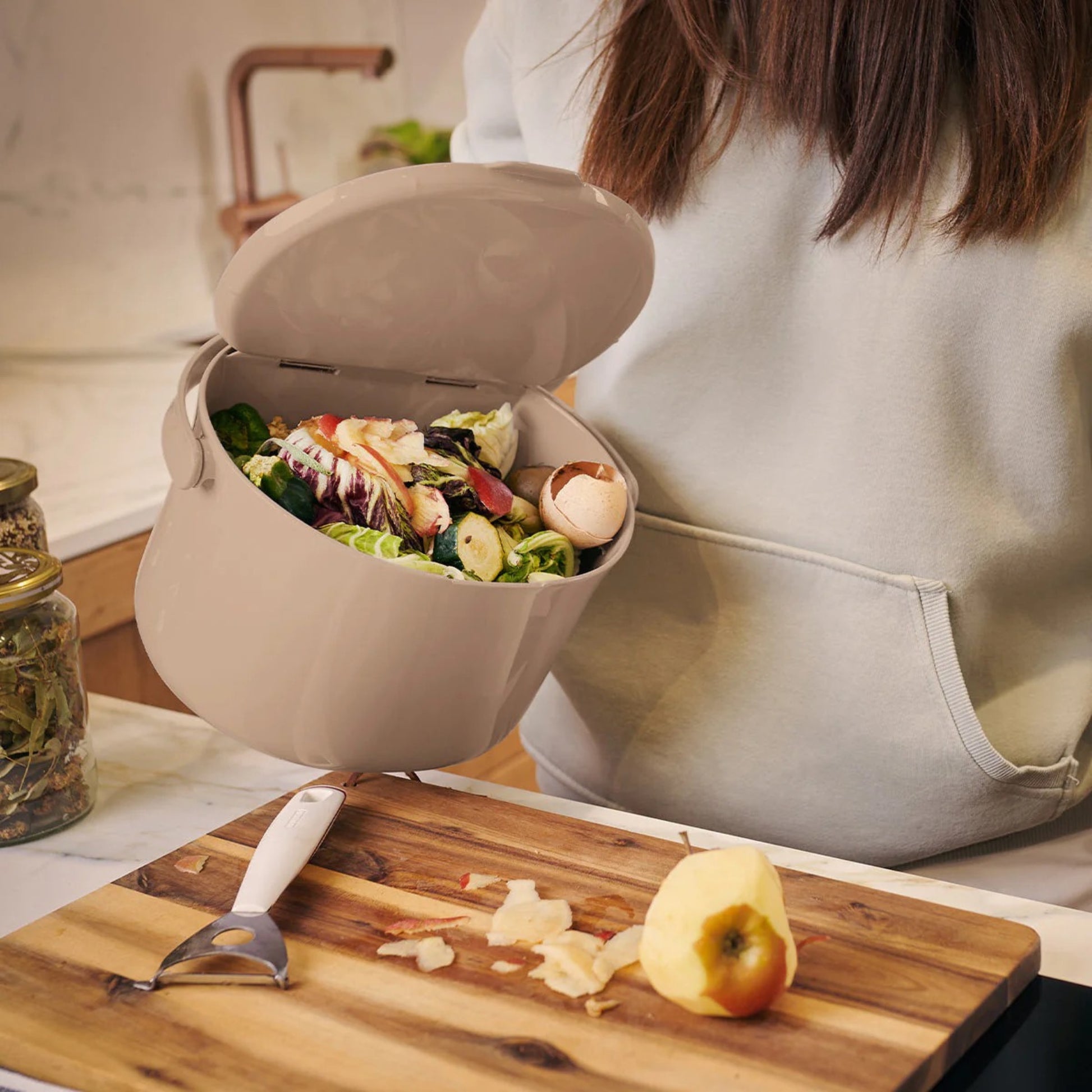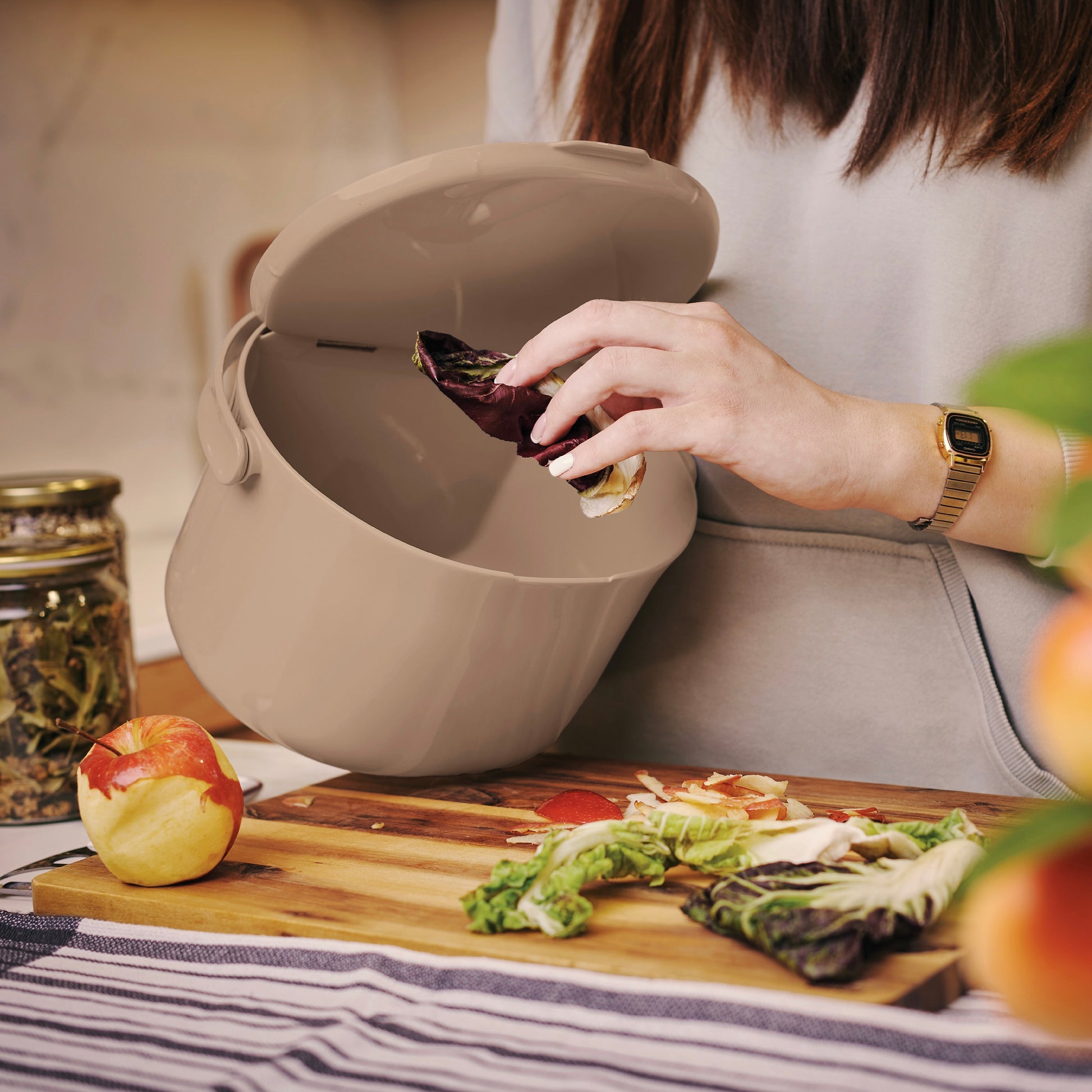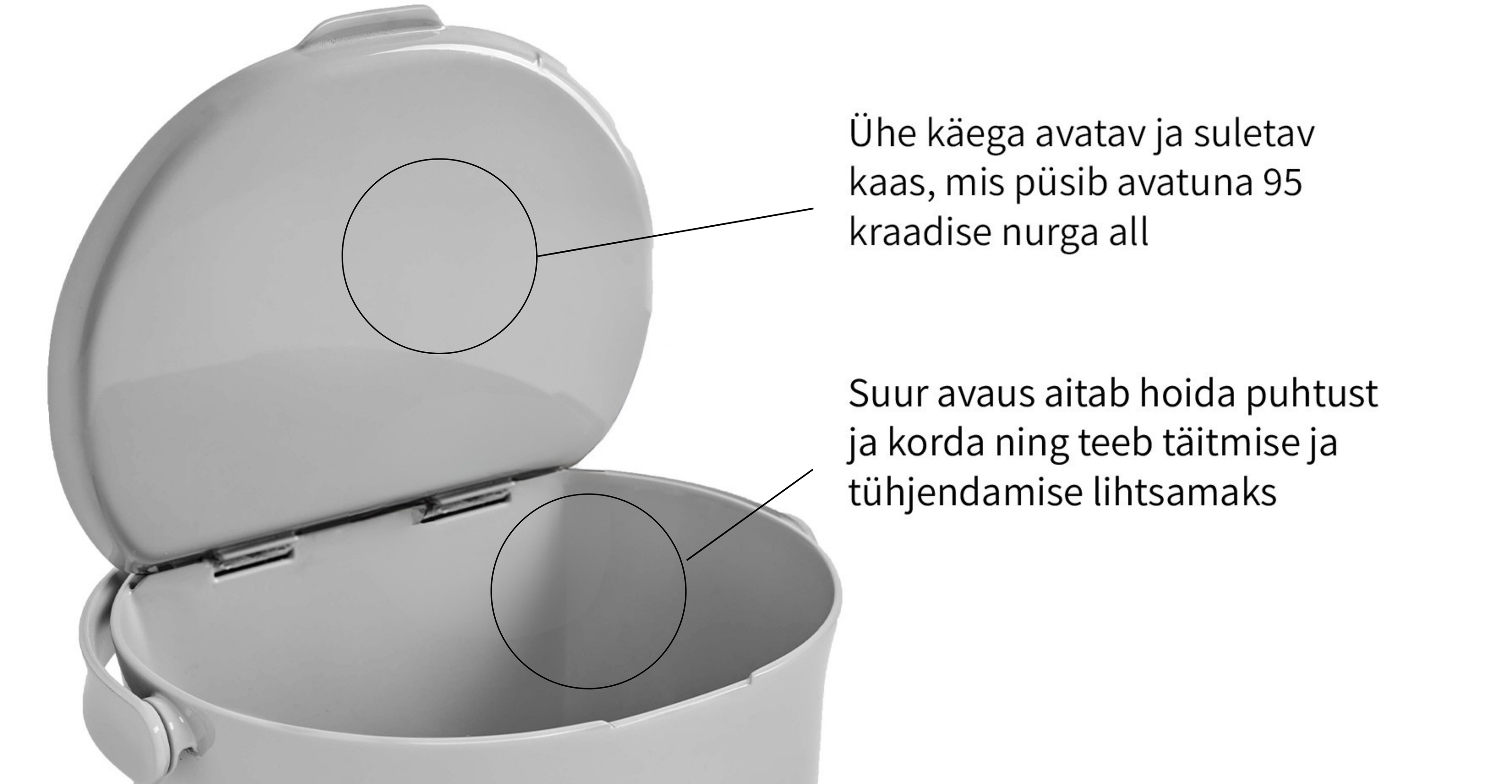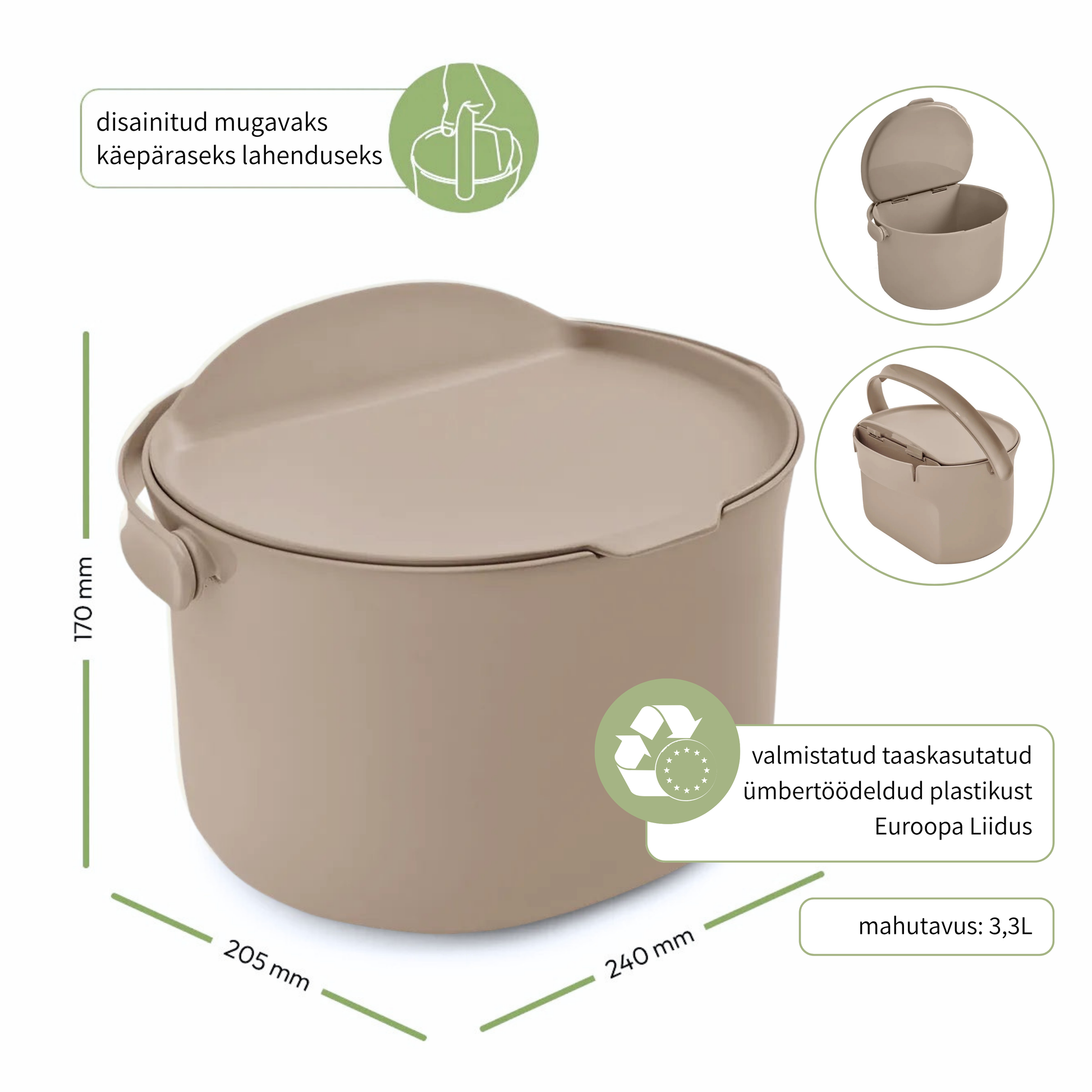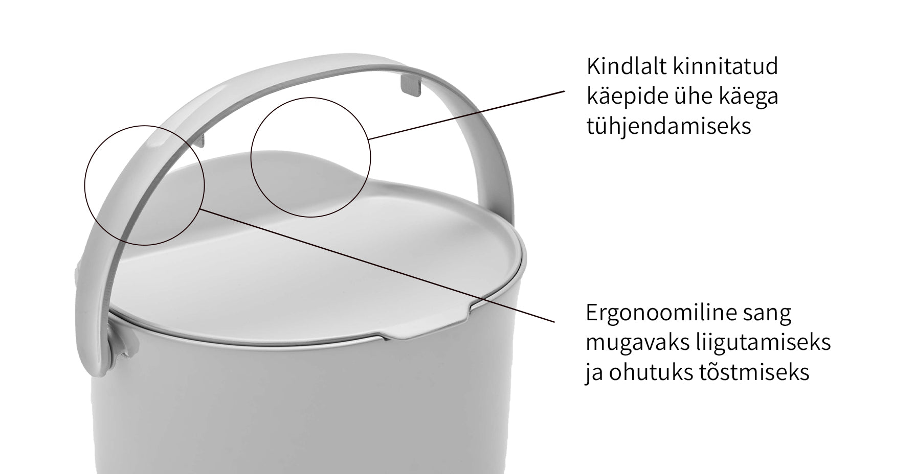 - Ergonoomiline ja kindlalt kinnitatud käepide ohutuks tõstmiseks ja liigutamiseks kui lähed õues asuva biojäätmete prügikasti või kompostri juurde.